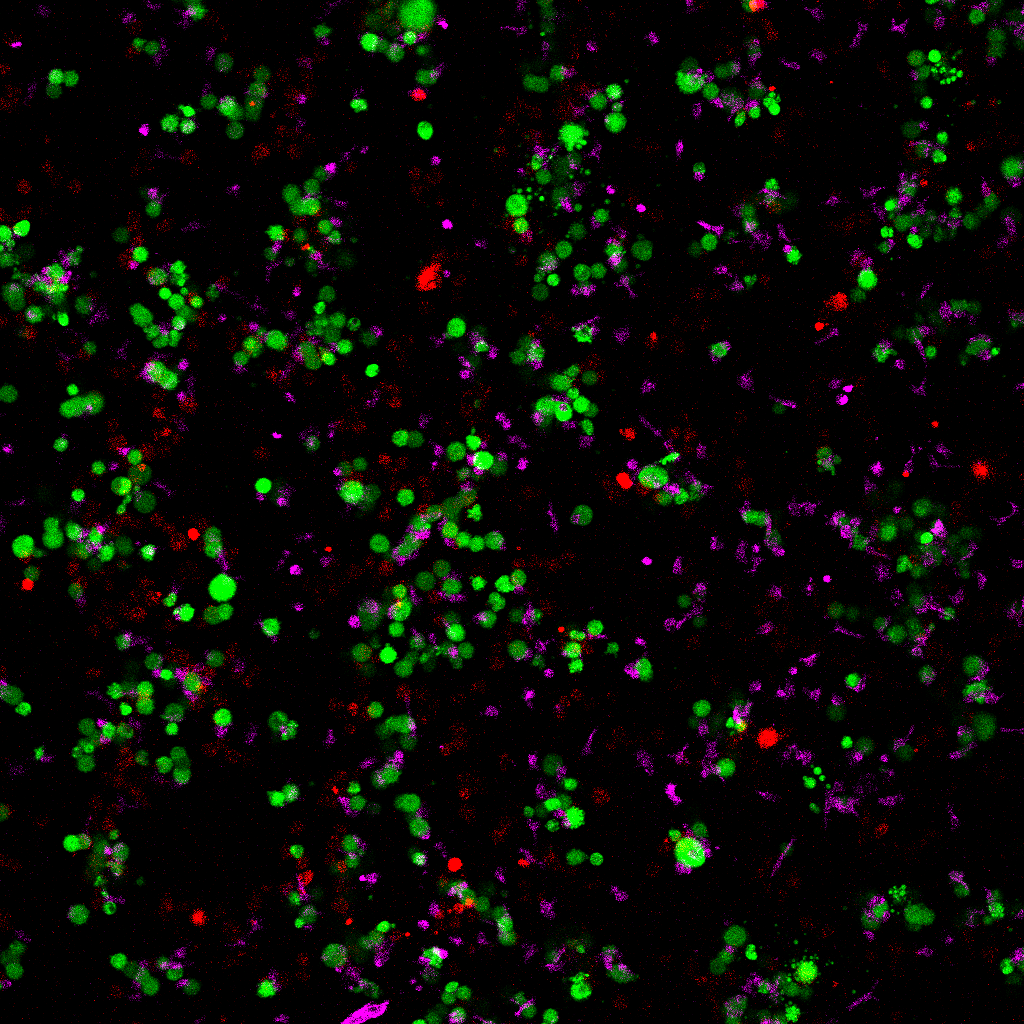 Close-up of lightsheet data highlighting immune–tumor cell contacts. Green: eGFP NY-ESO-1 cancer cells; Magenta: target-specific engineered T cells.