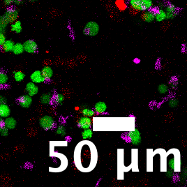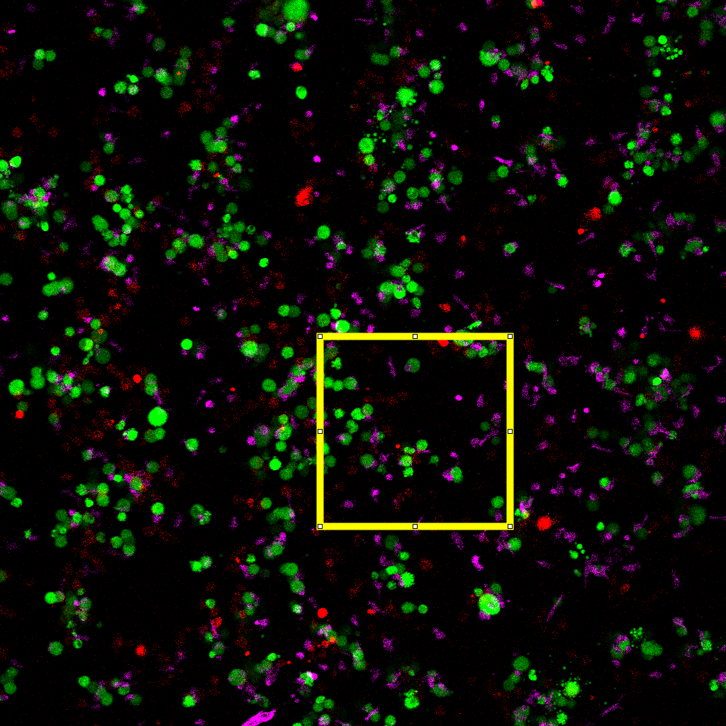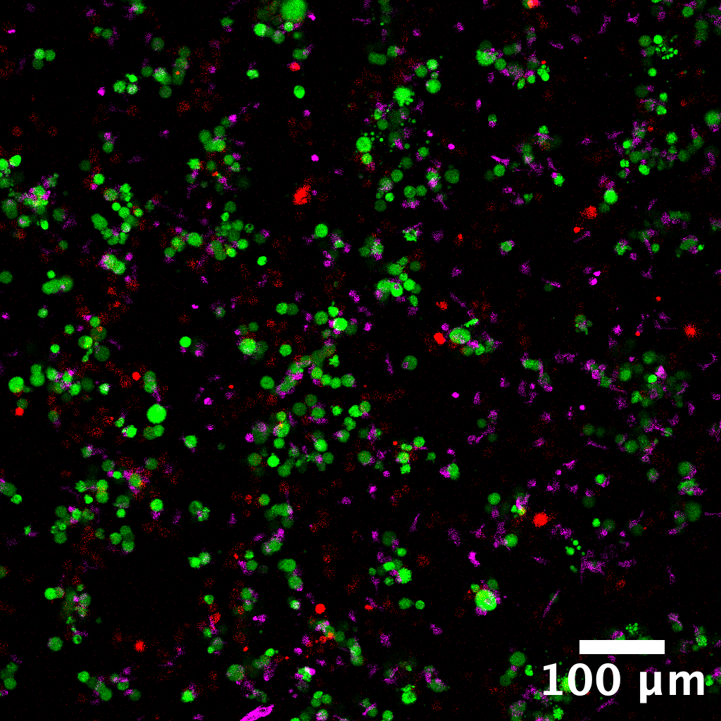 Full-field composite image with scale bar. Channels: T cells (red), cancer cells (green), PI death marker (blue).
