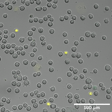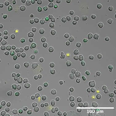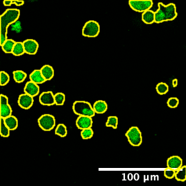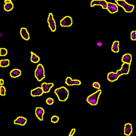 Cellpose segmentation labels overlaid on the cancer cell channel (cropped). Labels are used for PI intensity measurement.